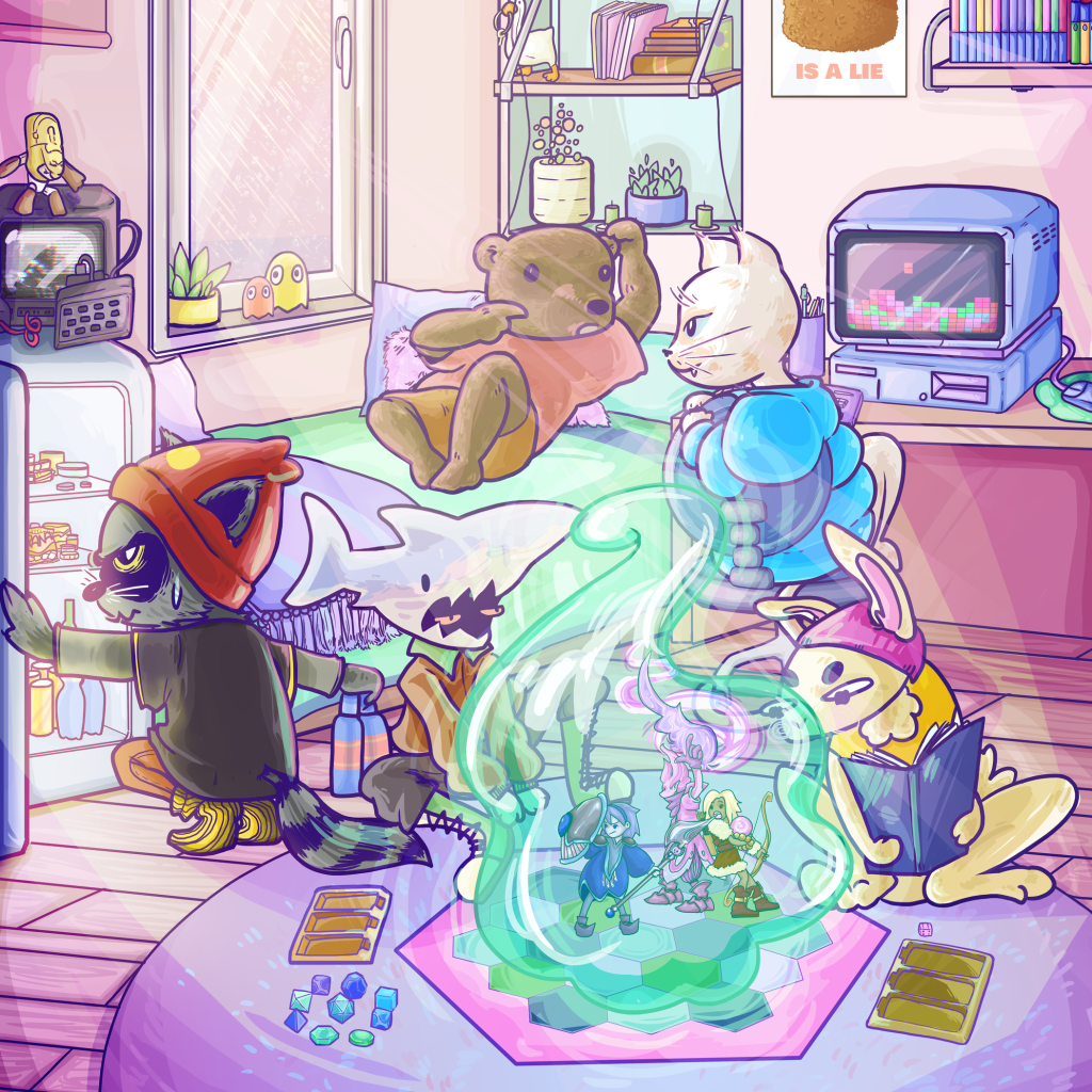 It’s about video-game and alternative entertainment, so of course I put all the references I could: Pokemon, Among Us, Final Fantasy, Portal, Pac-Man, Tetris, Mario, Kirby… even some indies like Mackarelmedia Fish.