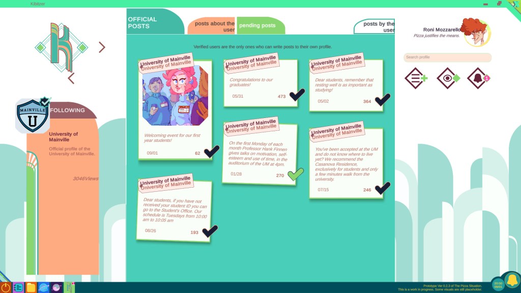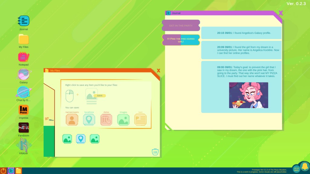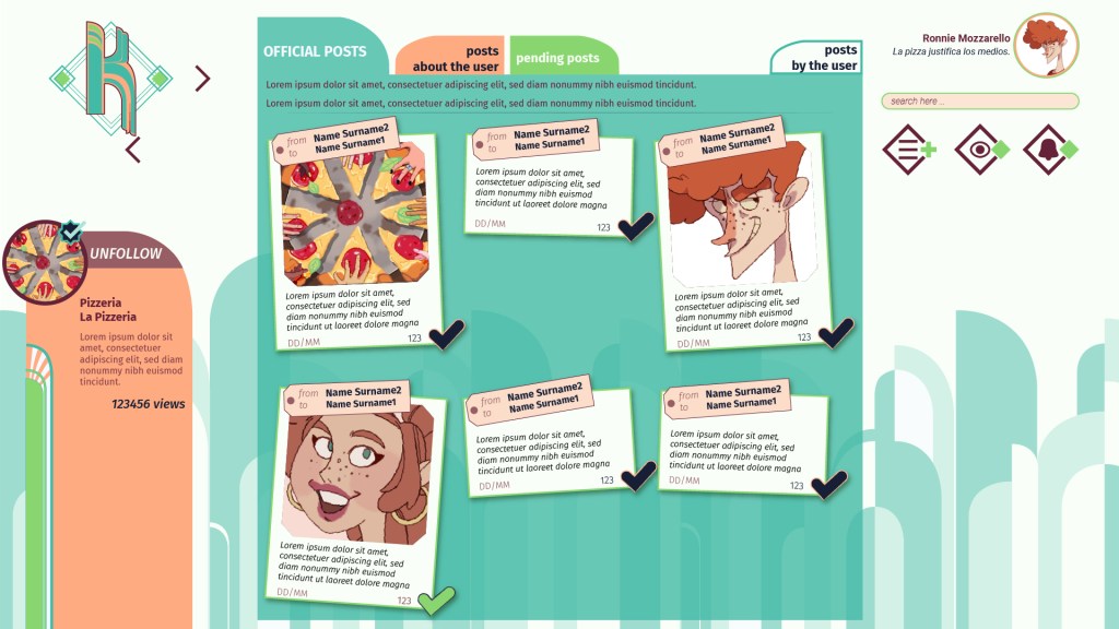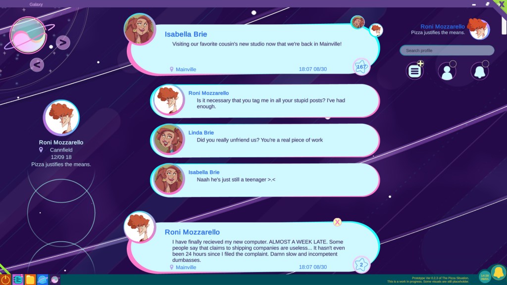 The Pizza Situation is an over-the-top simulation of social networks where the surreal narrative is complemented by the main game mechanics: stalking, scrolling, investigating and manipulating through social media.
